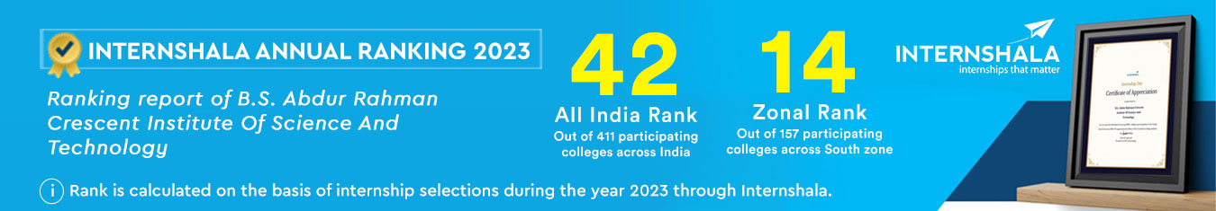 B.S. Abdur Rahman Crescent Institute of Science & Technology has an exclusive Career Development Centre headed by Dr. K. Ganesh. The placement process begins with Pre-placement talks by companies, usually scheduled in the month of August and the placement process commences from the month of September. Participation by a large number of reputed organizations year-after-year is a testimonial for the reputation of the Institute. The primary function of the placement office is three fold, the first and foremost is creating awareness about the placement process through a series of awareness programmes. The next task is to train them to face the forthcoming placement seasons through a set of placement training through experts in the sector. The last but the most important function is to streamline placement process as per the convenience of students and recruiters. An elaborate slotting criteria is used to slot the companies for the placement process.